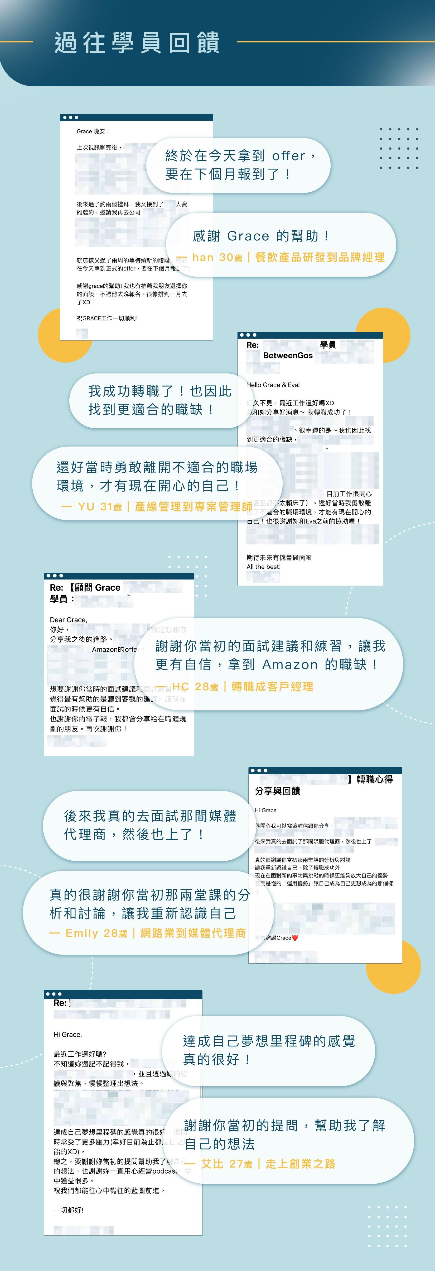 ❝ 透過職涯教練 Grace 的教學引導,更清楚、具體化的幫助自己看見以前沒有注意到的能力,以及可能可以嘗試的機會 ❝