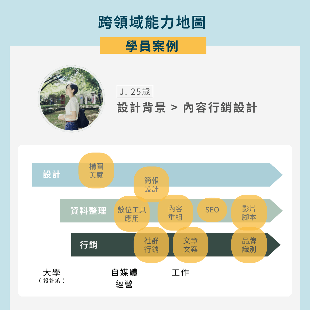 ➥ 盤點自我優勢:透過「跨領域能力地圖」、「求職關鍵字」分析個人優勢 X 潛在市場機會