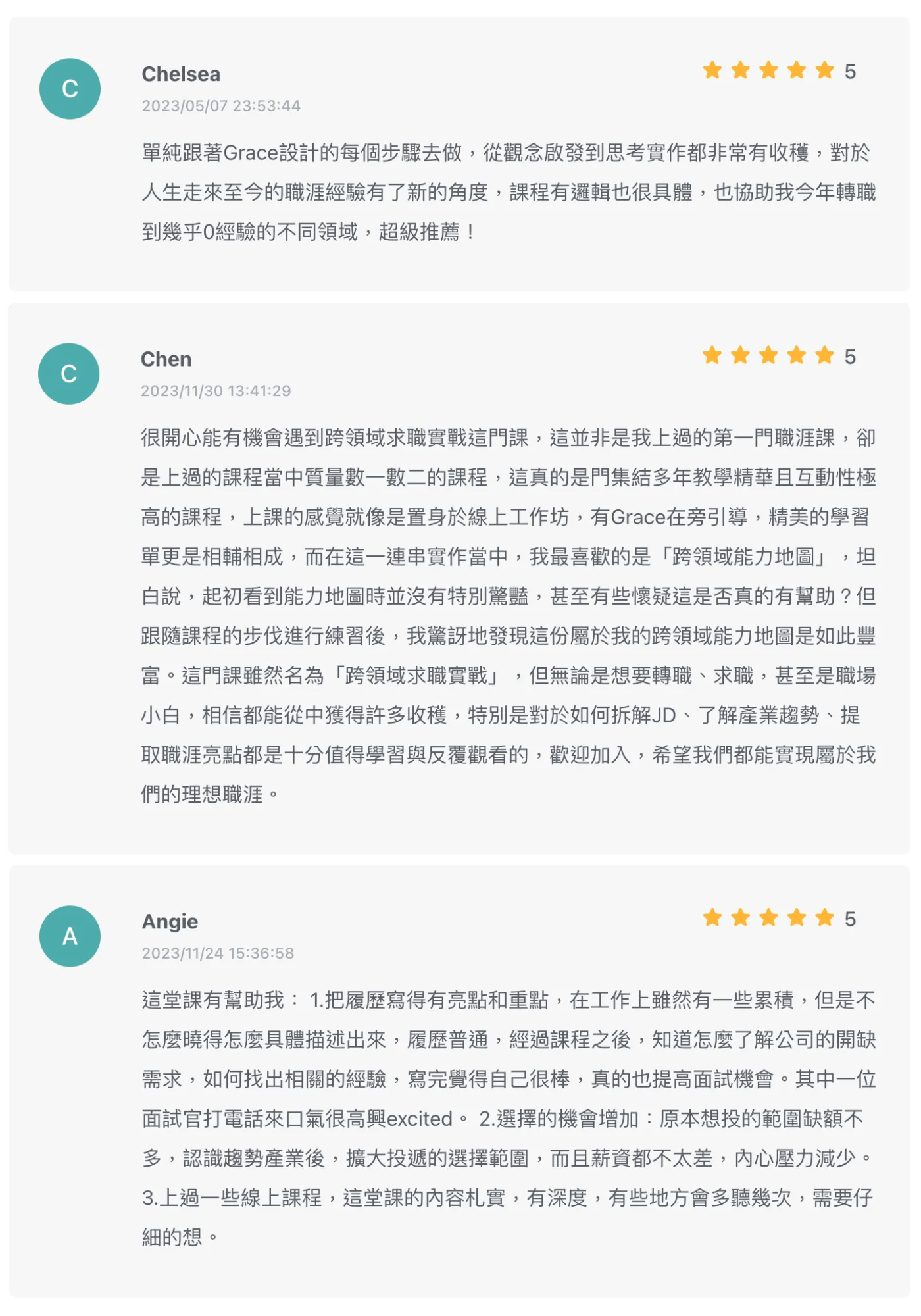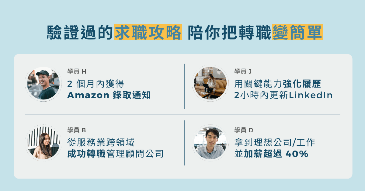 相信你也能和他們一樣,透過《跨領域求職實戰課》一步一步規劃適合自己的職涯路徑!