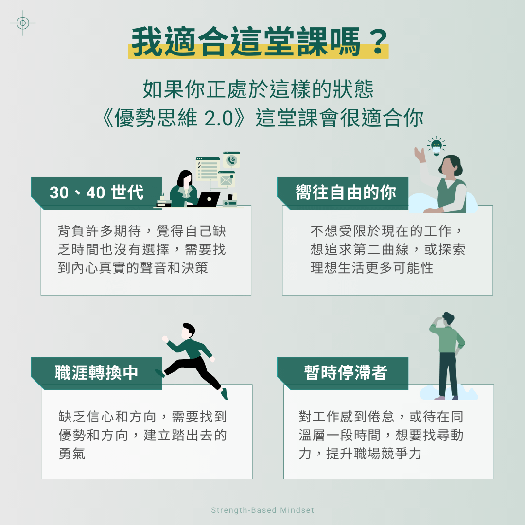 邀請你一起加入課程,把「優勢思維」更好的落實在個人的工作場景中,開始自我實現、自我成長,往更適合、更理想的職涯前進!