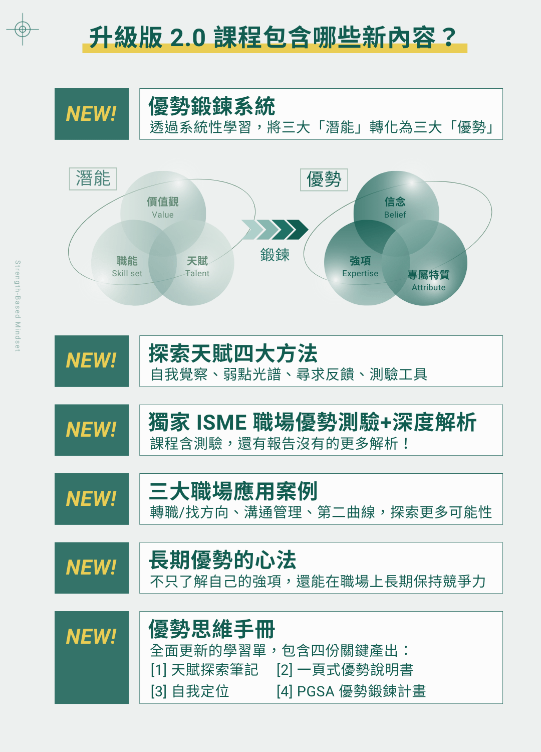 「優勢思維2.0」 採用了經過 1.0 驗證的系統流程,幫助你從零開始找到並強化你的優勢。