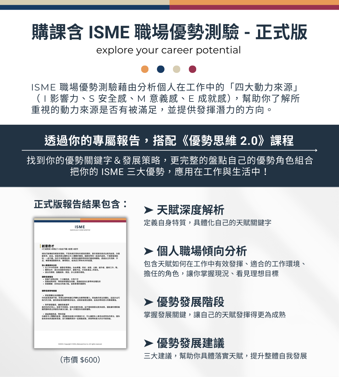 - # 購課含 ISME 職場優勢測驗正式版報告 (市價 600 元)