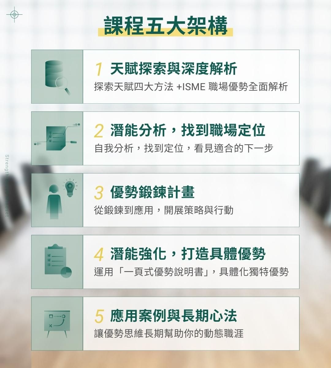透過《優勢思維2.0》課程,你將系統化地挖掘自己的潛能,並用「組合式思維」更清楚地描繪自己的優勢輪廓,真正為你帶來突破,幫助你在職場上高效且自信地前進。